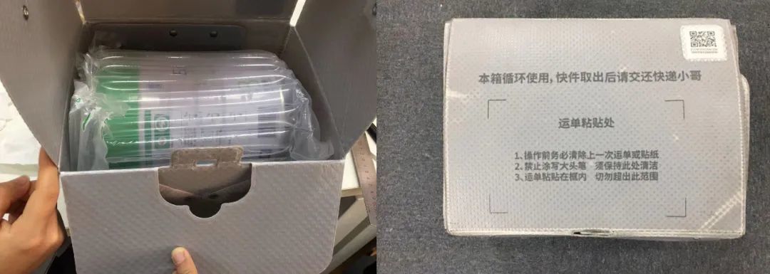 这是他给孩子买的新奶粉,然而包装不似寻常——外观些许磨损,没有纸箱泡沫,也没有以往的封箱胶带,采用折叠自锁设计的箱子,只需拨开卡口就能取出产品。包装上还印有这样一句话:“本箱循环使用,快件取出后交给快递小哥。”