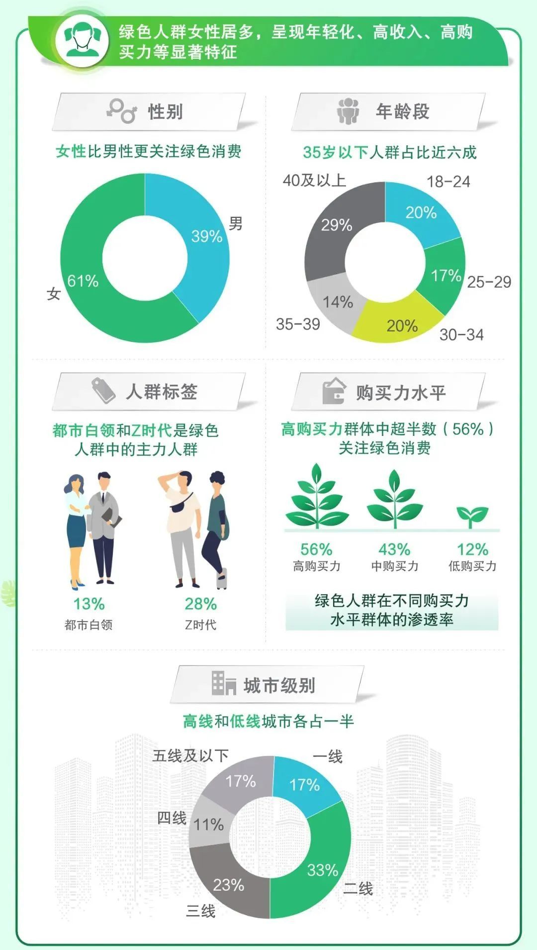 波士顿咨询公司(BCG)与天猫在今年“世界地球日”的调查报告显示,“绿色消费人群”已占淘系年度活跃人群的16%,约1.6亿,其中35岁以下占比近6成,“Z世代”“都市白领”是其中的主力军、高购买力人群超过半数。这是在淘系消费人群中颇具增长潜力的人群,他们的购买行为可作为新一代消费者的潮流风向标,也是品牌拓展市场、进行产品创新的新空间。