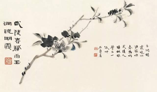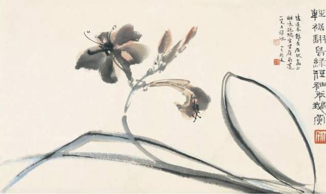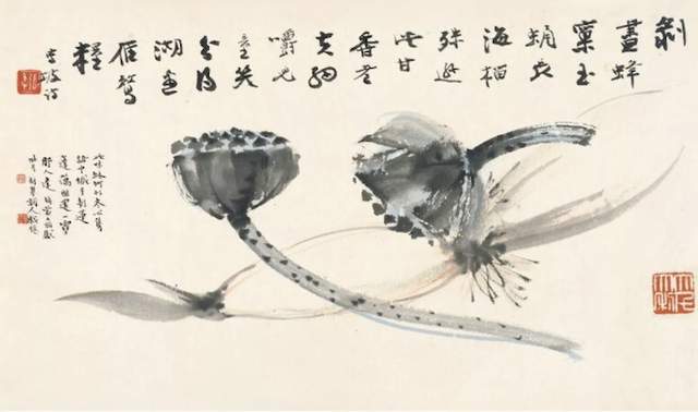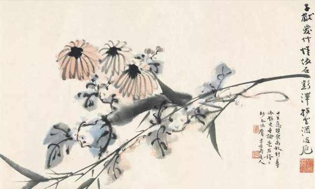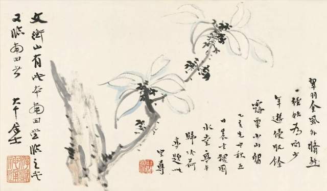 张大千笔下写意花卉,早年取意青藤白阳,力追八大山人、石涛,见其二十年代末的六尺巨幅画作《清湘大观图》,及一九三三年赠送给张群的山水花卉册,皆功力精絶,浸淫殊深。本册虽未署年,若以画风、笔墨及寿石工,题跋时间推知,大约写于一九三五年间,风格与赠张群的册页相近,该册上题“漫拟白阳青藤大风大涤诸家”,即可引证笔下渊源所自。