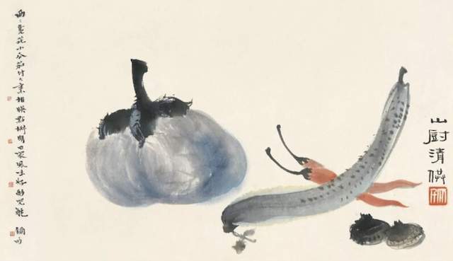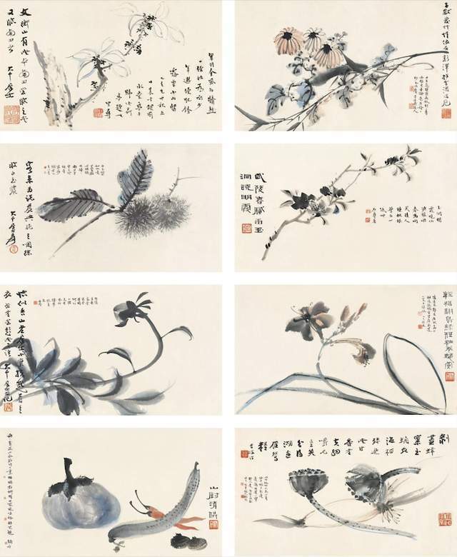 《花卉蔬果》册页八开,除了一张清供图外,其余者皆为花卉写照。画面素淨,构图简约,无背景配置,任凭花卉各呈其姿。每开花草一二,或纷繁结聚,或相对互映,或结果枝头,或疏干横斜,交集掩映间,风致嫣然,俗气全无。其用色雅淡,与水墨相混合,摄诸物情态,兼博纳众家之长,格调清奇,写来舒畅恣放,似漫不经心,实则融会贯通,与古人相契合。