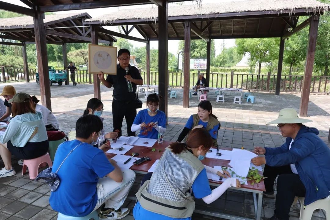 走出博物馆,同学们来到城子崖遗址发掘现场。现场负责人房书玉介绍了今年的发掘目标、发掘进度及新近主要收获,并同焦家考古队的师生们互相交流发掘经验,比较两遗址在堆积情况、遗迹现象和遗物特征等方面的异同。最后,师生们又共同来到遗址公园内的公众考古体验区,在进一步交流心得体会的同时亲身体验植物拓染并完成了属于自己的、独一无二的拓染作品。