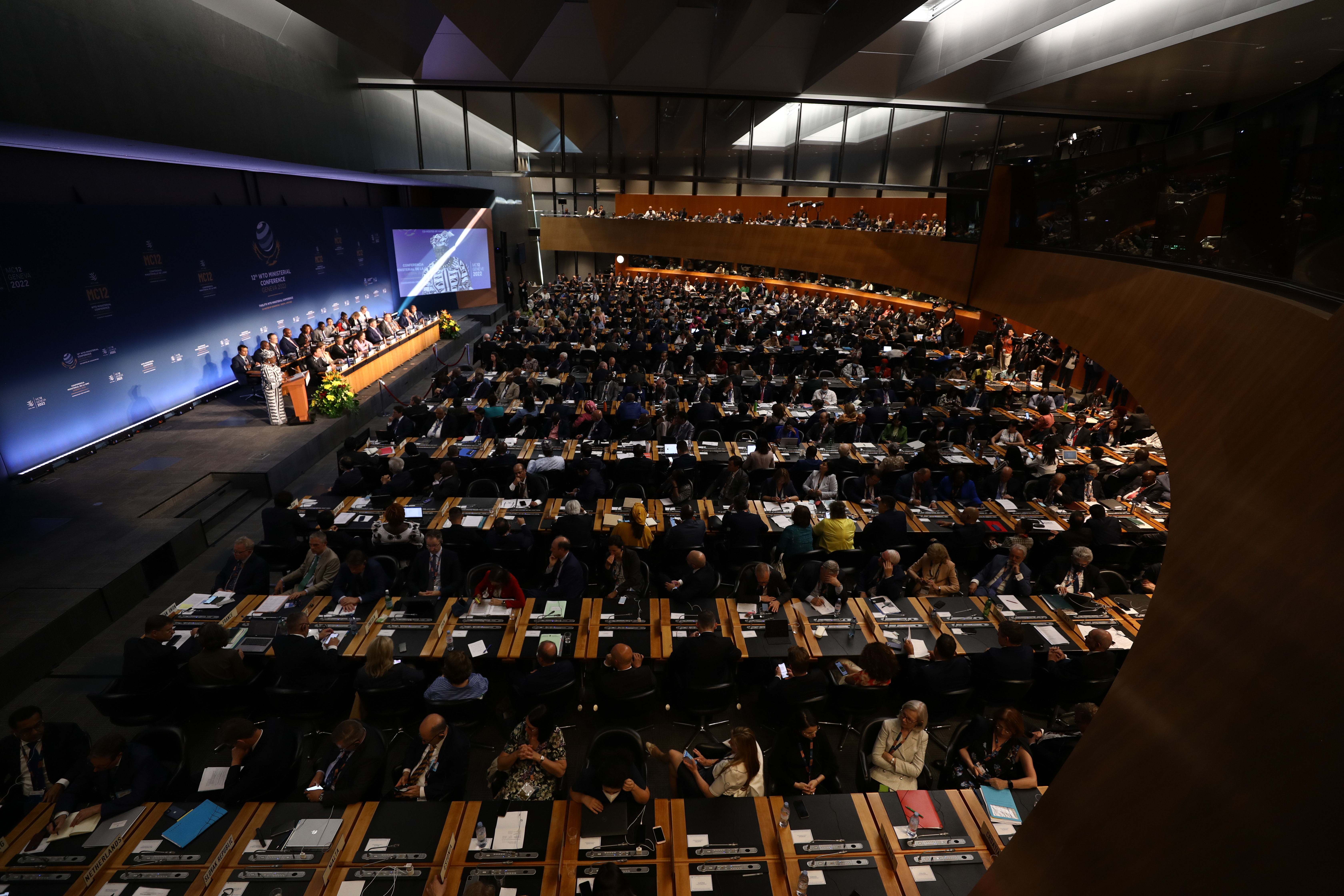 这是6月12日在瑞士日内瓦拍摄的世贸组织第12届部长级会议开幕式现场。(新华社发,世界贸易组织供图)
