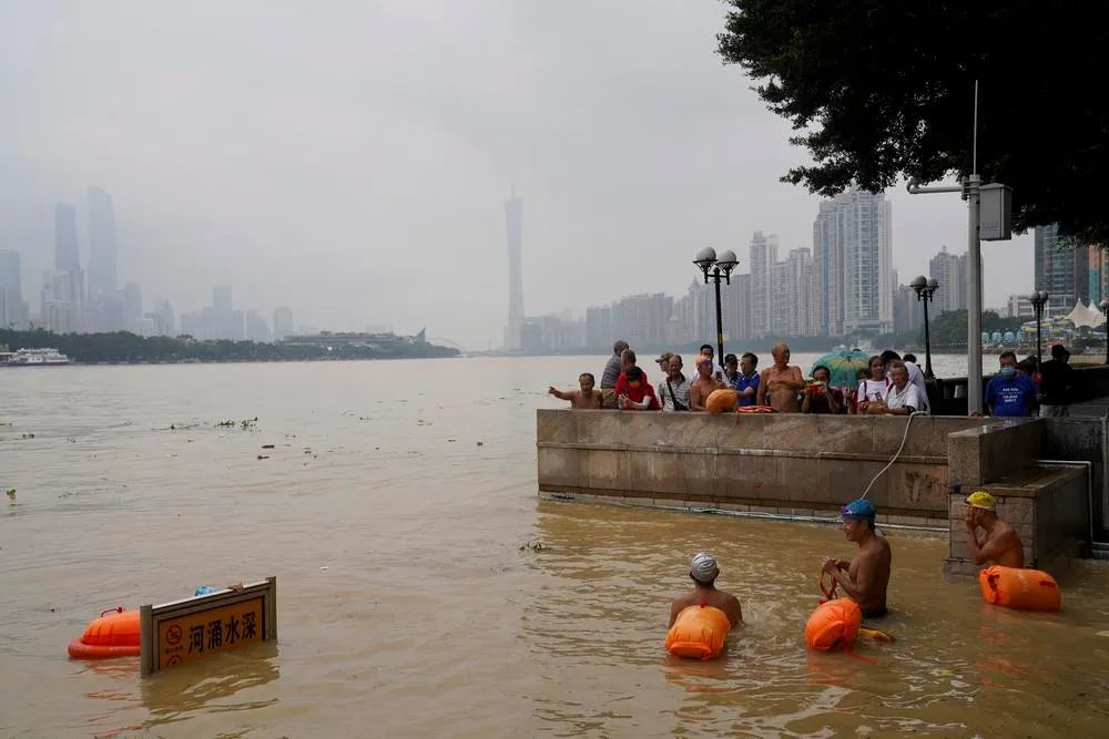 广州海珠区海印公园临江地带水位高涨,闻讯而来的市民在一旁围观高水位。几名游泳爱好者不顾劝阻仍坚持下水游泳。羊城晚报全媒体记者 宋金峪 摄