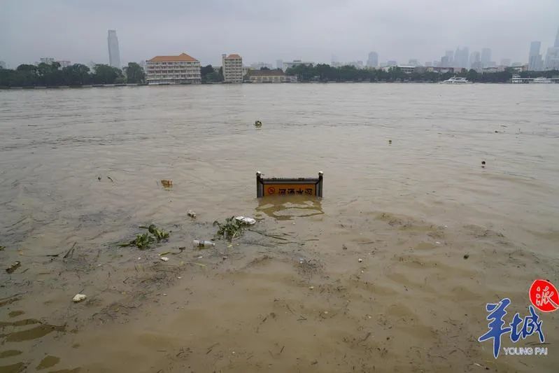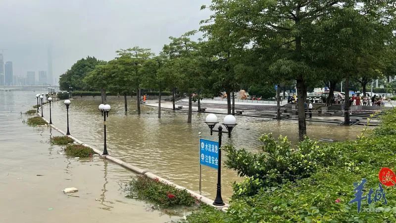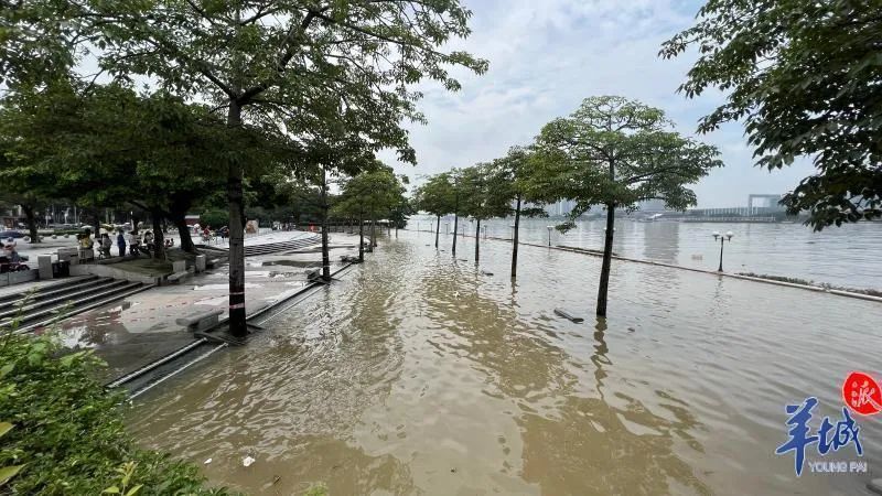 记者6月15日12时许在员村和海印公园两处临江地带看到,珠江江水已将上述两地的亲水平台“藏于水下”,只能凭稍微露出水面的护栏或电灯柱分清原来的道路。