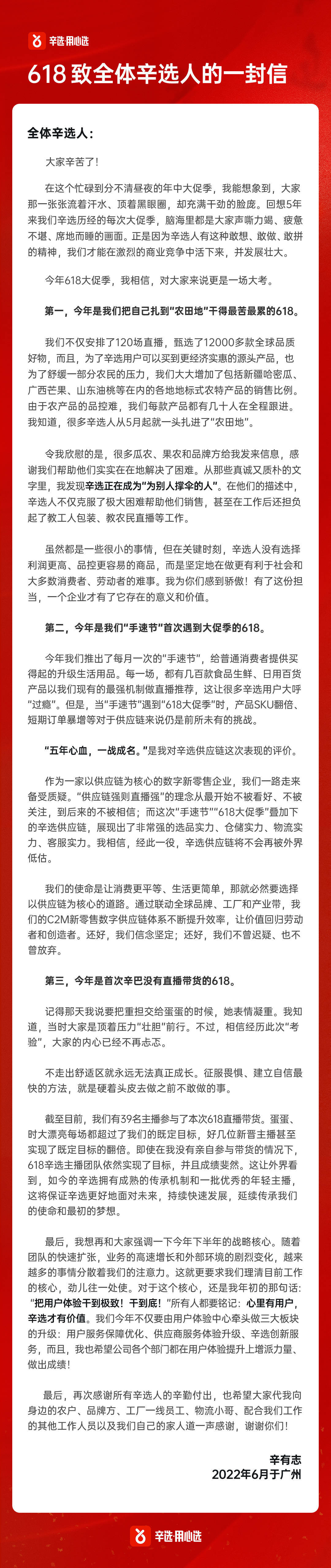 在信中,辛有志让所有员工铭记:心里有用户,辛选才有价值。