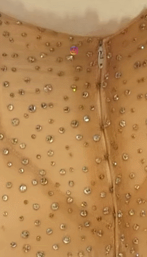先看看Met Gala之前的照片,礼服背面的拉链上还有一排挂钩,面料上镶了大大小小的水晶珠。
