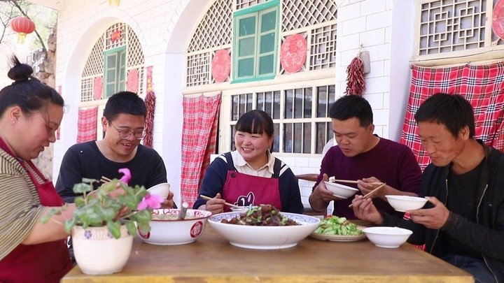 淳朴而动人的画面里,排骨刀削面、猪肉炒蒜苗、红烧肘子、水晶皮冻、烩粉汤、烤羊排……一道道陕北农家菜让屏幕前的人们不由得心生暖意,跟随霞姐的家人们一起说出“猛香哩”。