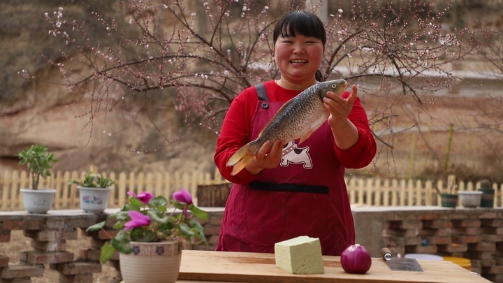 陕北霞姐(王敏)在自家院内做鱼。(受访者供图)