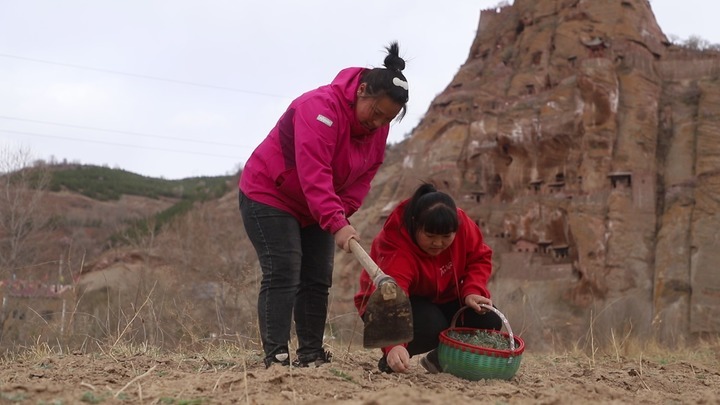 陕北霞姐(王敏)(右)和妹妹(蓉蓉)(左)在地里挖白蒿。(受访者供图)