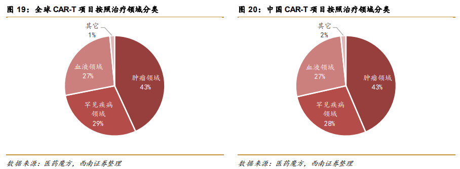 从治疗领域来看,CAR-T细胞治疗面向肿瘤领域占比超40%,罕见病领域占比近30%,血液疾病领域占比27%。