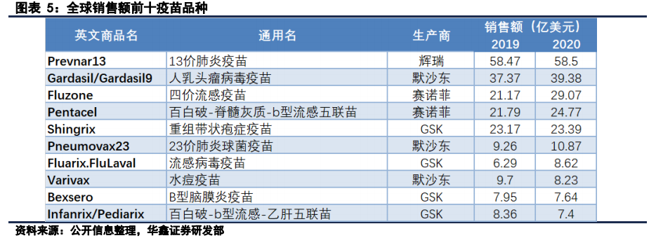 2020年,全球销售额前十的疫苗品种销售额合计达218亿美元,占全球疫苗销售额的一半以上。
