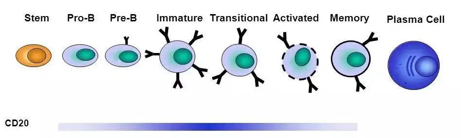 在人体B细胞的发育分化周期中,从前B细胞到成熟B细胞,CD20的抗原表面丰富度逐渐增长。而在最后阶段B细胞分化成浆细胞后,CD20不表达。