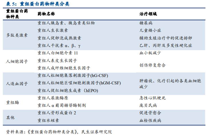 目前,常见的重组蛋白药物主要包含多肽类激素、细胞因子、造血因子、重组酶等,可用于多种疾病的治疗。