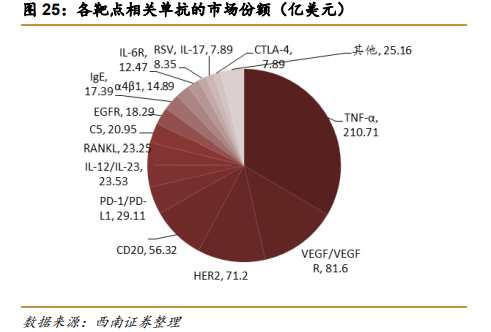 目前,在已经批准上市的抗体药物中仅有27个靶点,其中5大热门靶点合计占据了72%的市场份额。