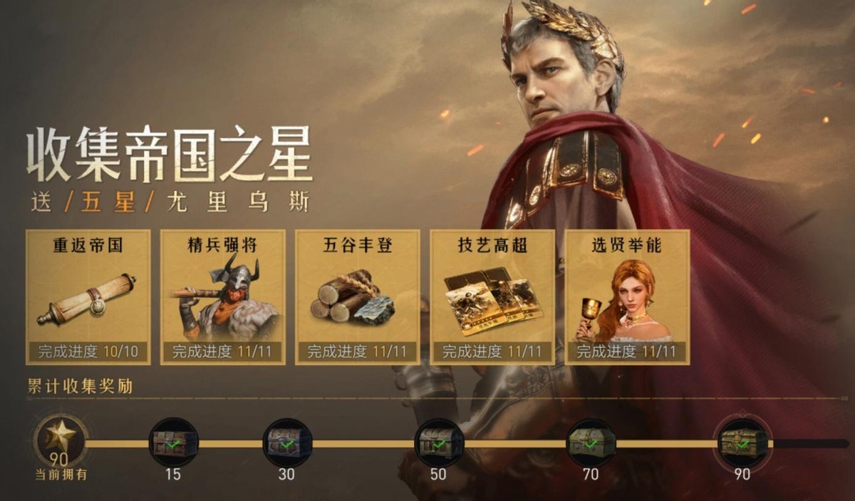 第二是【帝国之星】,这个活动难度极低,只要不断完成任务就能获得丰富的道具奖励,而且集齐一定量的代币后还能直接白嫖五强力星英雄尤里乌斯,新人玩家一定要做完。