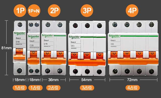 空气开关主要有:单极1P、1P+N(DPN)、二极2P、三极3P、四极4P五种。其中3P、4P应用在380V的电路系统,而家用都是220V的电路,所以前三种是最常用的。其中,P代表的是极,简单讲就是空开占据空间的大小(1P=18mm)。