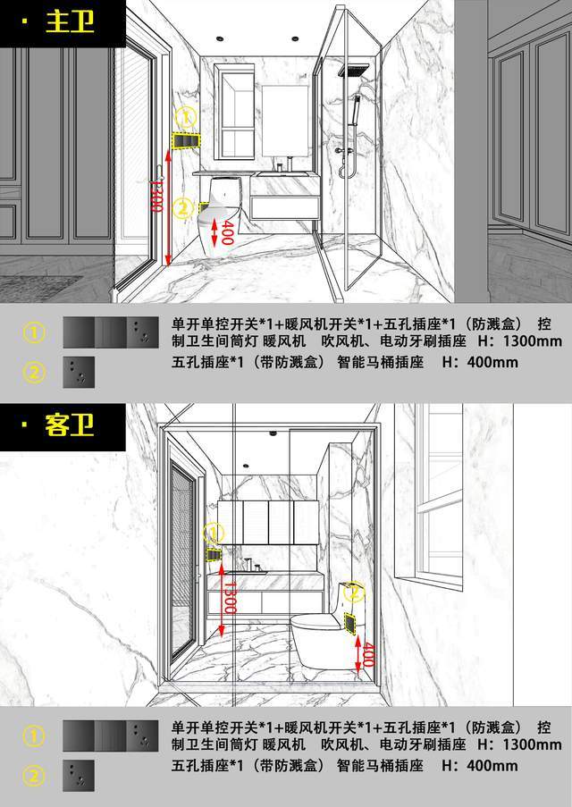 卫生间插座:卫生间由于有风暖浴霸,电热毛巾架,电吹风等大功率电器,而且卫生间本身比较潮湿,容易引起电路的短路,单独设计回路也更加容易检修。电线选择4平方的电线,空开选择C25(1P+N),带漏电保护器。