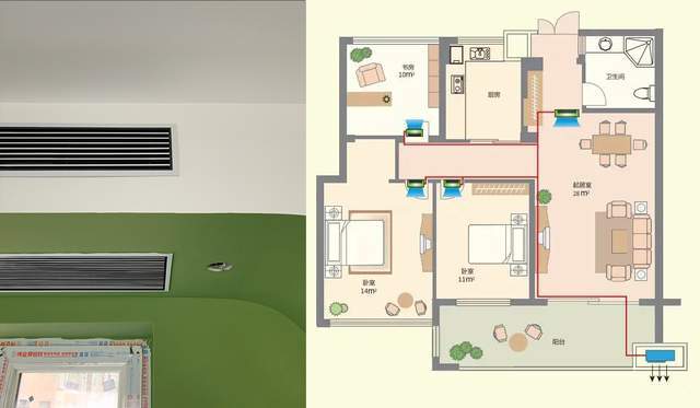 中央空调:室内机一路,室外机一路