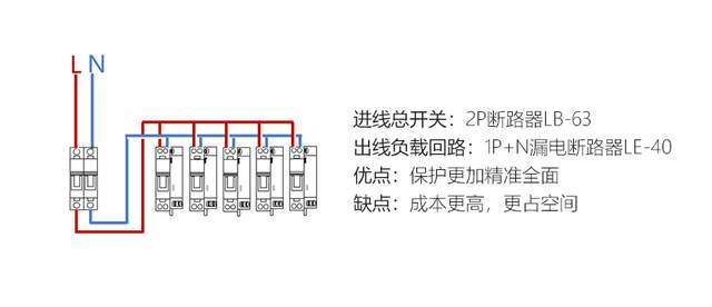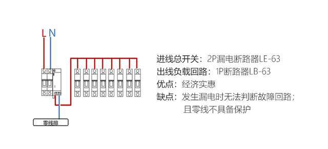 优点:只需要给总开配一个漏保,其它回路不用配,占用配电箱空间小、花费少。