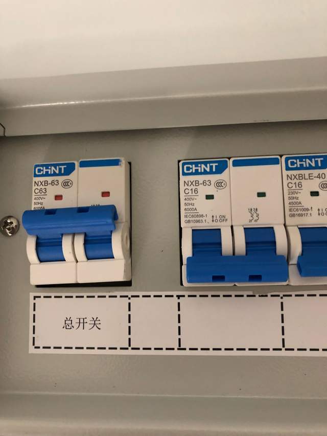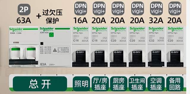 总开:也就是入户的第一个回路,一般入户的电线都为10平方,空开选择C63(2P),不带漏保。