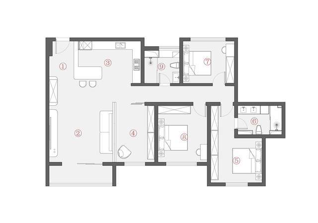 必备线路7路:总开、照明、普通插座1、普通插座2、厨房插座、主卧卫生间插座、公共卫生间插座