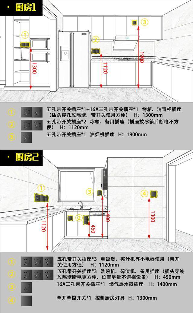 厨房插座:厨房使用电器比较多,建议先列出所需要的电器,算一下总功率再来设计回路,个别大功率电器甚至需要单独设置回路。电线选择4平方的电线,空开选择C25(1P+N),带漏电保护器。