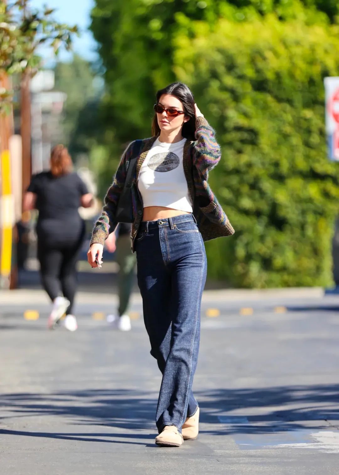 好闺蜜 Kendall 更是如此,选择宽松牛仔裤搭配白色正肩 T 恤沐浴在 LA 的阳光下,而脚上的 Birkenstock 则更显舒适。