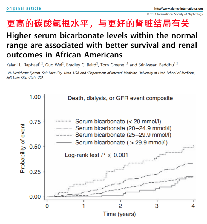 例如我们可以看到下面这篇,著名肾脏病杂志KI发表的研究分析,将4000多位慢性肾病患者分成了4组,碳酸氢根小于20mmol/l那组患者不良肾脏结局发生率最高。碳酸氢根<20mmol/l,尿毒症发生率,是碳酸氢根>25mmol/l患者的3倍。