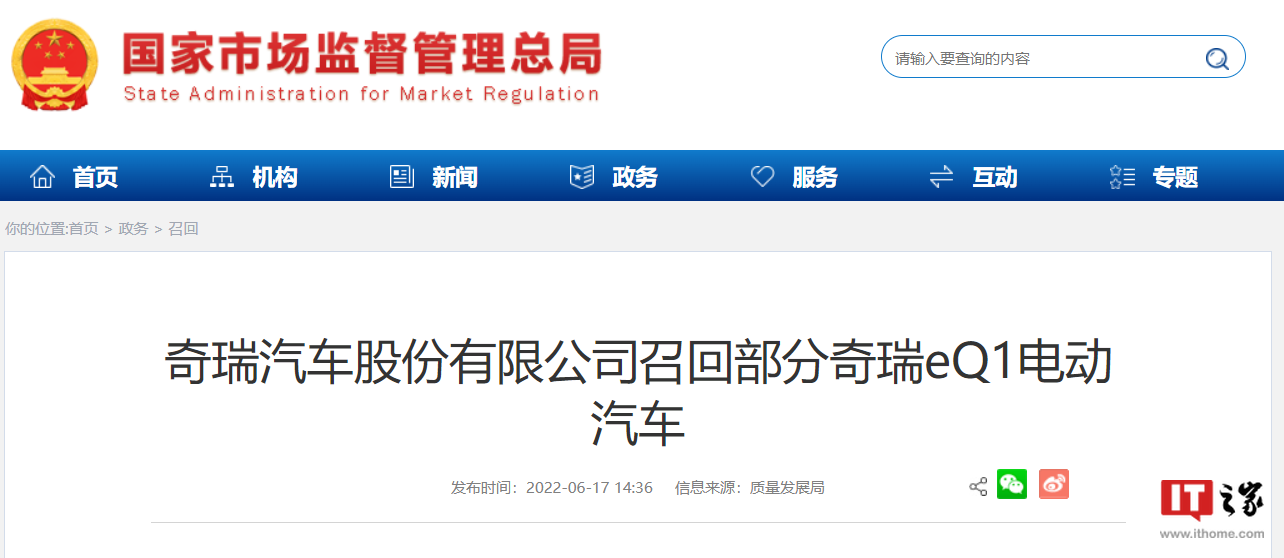 IT之家 6 月 17 日消息,国家市场监督管理总局质量发展局今日发布公告,日前,奇瑞汽车股份有限公司根据《缺陷汽车产品召回管理条例》和《缺陷汽车产品召回管理条例实施办法》的要求,向国家市场监督管理总局备案了召回计划。决定自即日起,召回 2018 年 6 月 1 日至 2018 年 7 月 31 日生产的部分奇瑞 eQ1 电动汽车,共计 8067 辆。