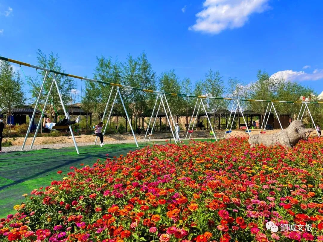 凤园花海绿树环绕、青草依依,凉亭、栈道错落有致,站在坡地高处远眺,沿黄快速通道尽收眼底,清风徐徐、心旷神怡,小火车、七彩滑道、星空小屋点缀其间。凭栏远眺,阳光正好,微风不燥。