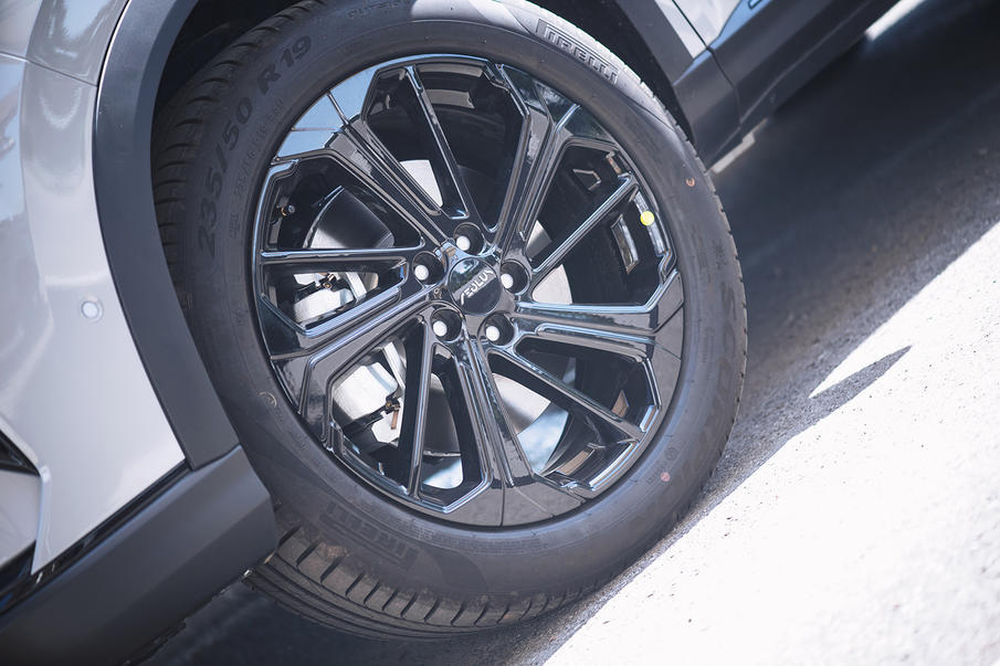皓极配备的是黑色花瓣状轮毂,虽然从视觉冲击力上来看黑色轮毂没有双色轮毂来的直接,但是这款19英寸的轮毂还是可以很好的体现出车辆的运动感,也与皓极双色的车身配色很搭。
