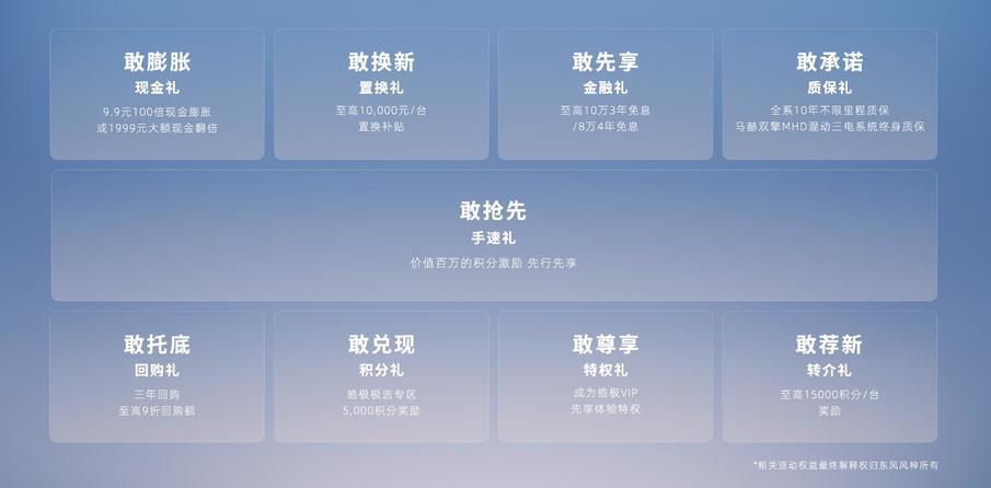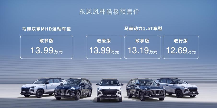 2022年6月18日,东风风神通过网络形式宣布,旗下的全新双擎SUV——东风风神皓极正式开启预售,预售价格区间为12.69万至13.99万元。新车将会推出四款车型,分别为1.5T敢爱版、1.5T敢享版、1.5T敢行版和马赫双擎MHD混动车型。