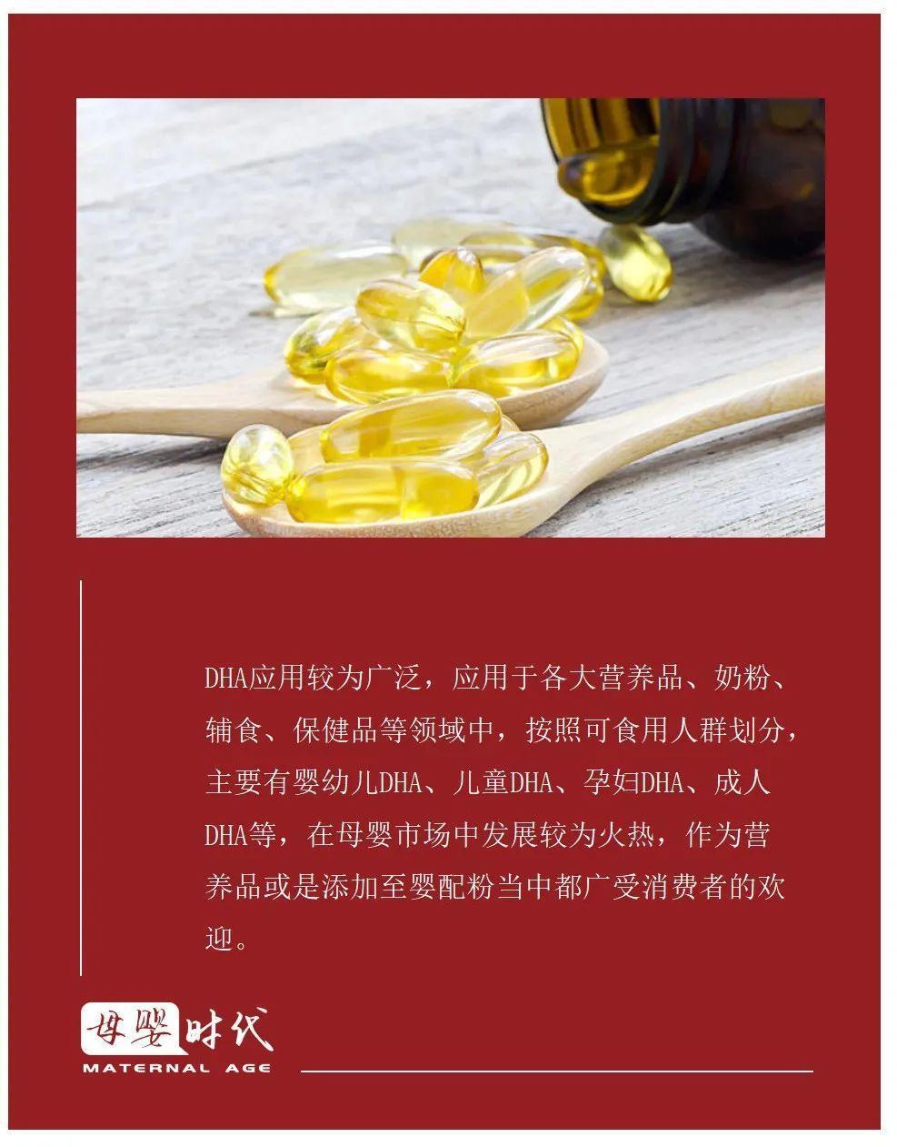 DHA应用较为广泛,应用于各大营养品、奶粉、辅食、保健品等领域中,按照可食用人群划分,主要有婴幼儿DHA、儿童DHA、孕妇DHA、成人DHA等,在母婴市场中发展较为火热,作为营养品或是添加至婴配粉当中都广受消费者的欢迎。