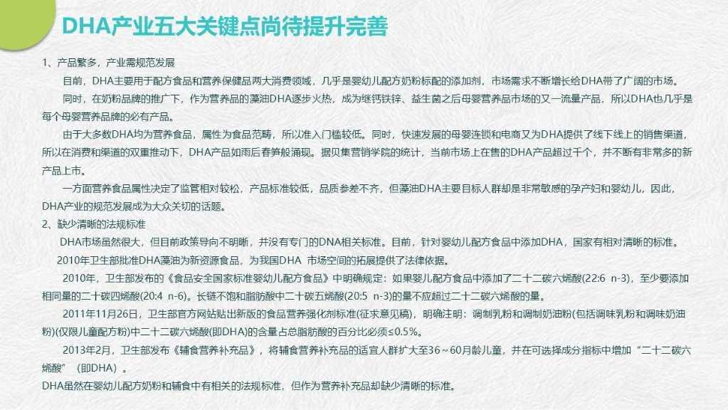 虽然关于DHA的建议书和规范正不断陆续推出,但DHA营养品行业内并无统一的执行标准,导致其产品品质参差不齐,行业发展较为混乱。