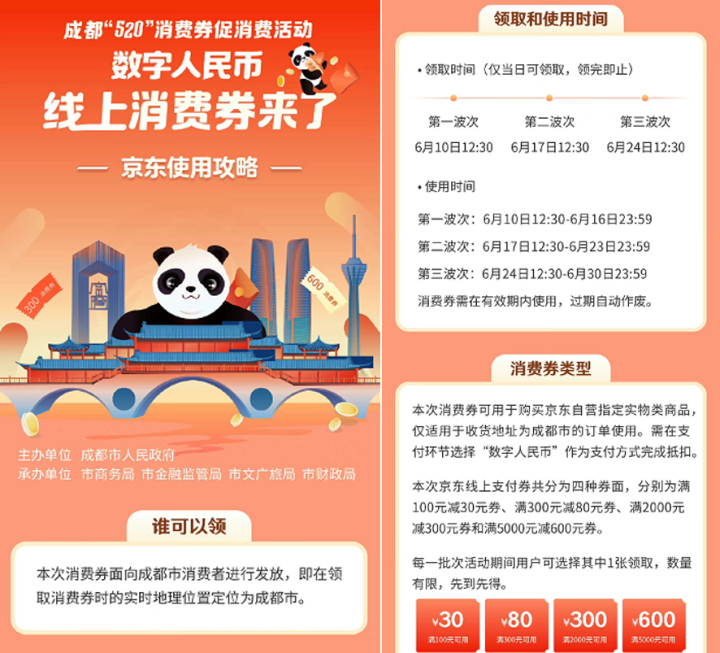 数字人民币线上消费券来了!为提振消费,满足市民多元化的线上消费新主张,6月17日12点30分,定位在成都的消费者可通过京东App领取成都数字人民币消费券。打开京东APP搜索“成都消费券”或“成都数字人民币”即可领取,消费券面额包括满5000-600元、满2000-300元等,用户仅可选择一种面额领取一张。除了成都消费者,郑州的朋友即日起至6月20日每天10点,也可通过京东App领取满4000-500元、满2000-300元等消费券。