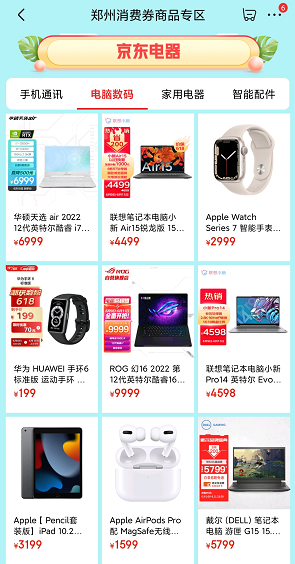 除了成都的消费者,郑州的消费者也可以在京东领取消费券,支持郑州城市消费券的电脑数码产品包括华硕天选air 2022 12代英特尔酷睿i7 15.6英寸轻薄游戏本、15.6英寸全面屏办公轻薄本联想笔记本小新Air 15锐龙版、15.6英寸电竞游戏本戴尔游匣G15、华为手环6等。