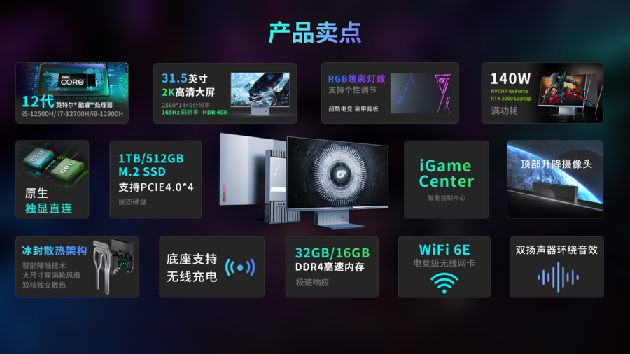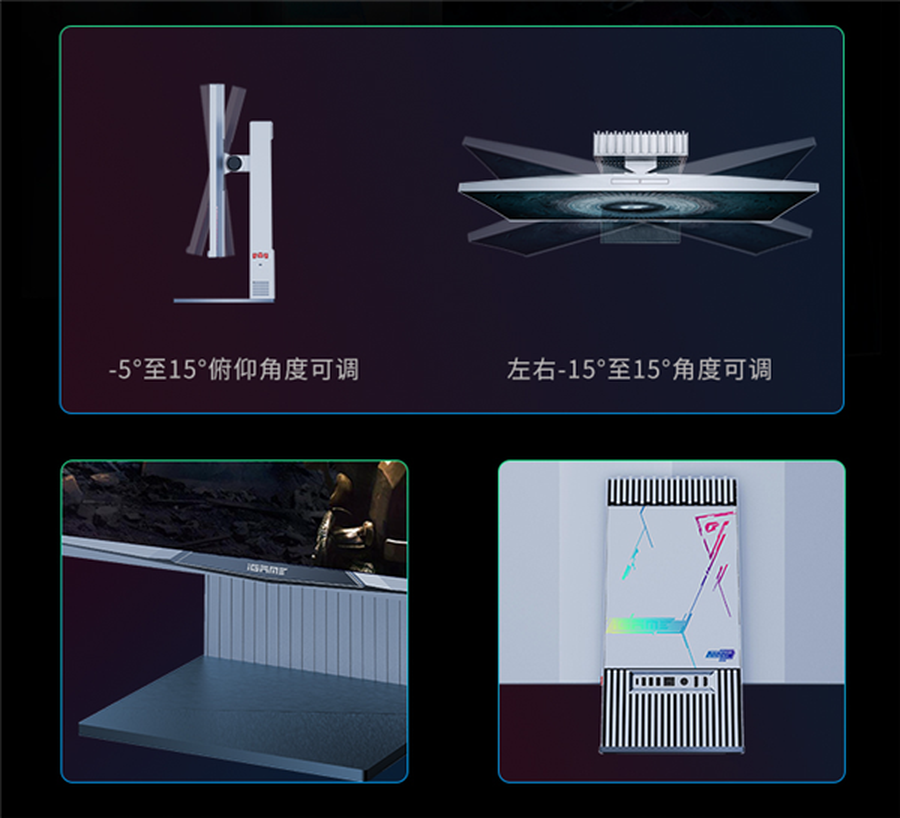 屏幕则采用了人体工学设计,支持俯仰和左右四个方向角度调节;拥有2*5W对称式双扬声器,体验影院级视听效果;WiFi 6E高速无线网络的加持,游戏极速畅玩;通过iGame Center控制中心,进行模式调节、灯效控制、系统监控。