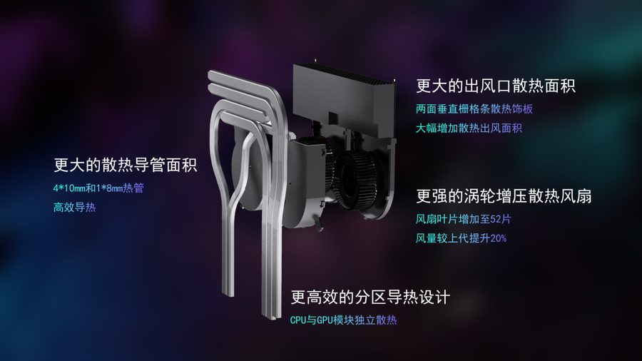 身为特殊形态的系统级产品,散热与噪音控制也是最被用户关注的重点。iGame G-ONE Plus为了更好的发挥CPU和GPU的实际性能,本代工程师们对其散热系统设计进行了大幅升级,配备更强的双涡轮散热风扇,风扇叶片增加至52片,风量较上代提升近20%;4根10mm和1根8mm热管分区导热,散热鳍片采用两面出风设计,整体散热效率相比初代提升了近30%,能够有效保障性能持续输出。