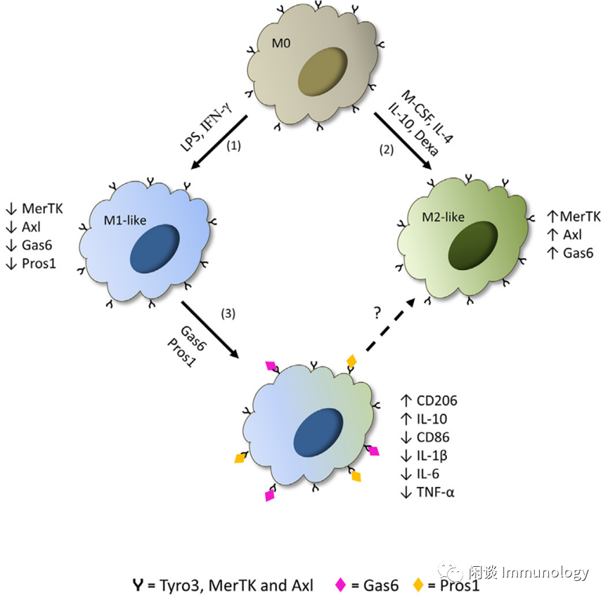 Gas6和Pros1都积极支持巨噬细胞从M1表型向M2表型的极化。Pros1激活MerTK或Tyro3,均降低了M1极化巨噬细胞中M1基因标记物IL-1、IL-6和CD86的表达。