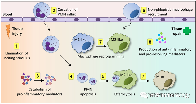 与抗炎药物不同,炎症消散是一个严格控制的过程,刺激因素消除,促进多形核(PMN)细胞的凋亡和efferocytosis,刺激巨噬细胞的非吞噬招募和巨噬细胞重编程,结束炎症过程和恢复组织稳态。