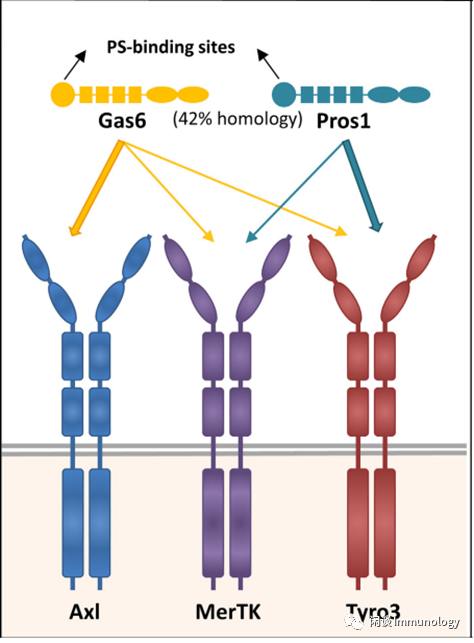 TAM配体Gas6和Pros1具有~42%的序列同源性,并在其氨基端谷氨酸残基(Gla结构域)上构成γ羧化。Gla结构域的羧化是Ca+2结合的一个重要过程,有利于与阴离子分子的相互作用,如磷脂酰丝氨酸(存在于凋亡细胞、包膜病毒、肿瘤细胞等)。