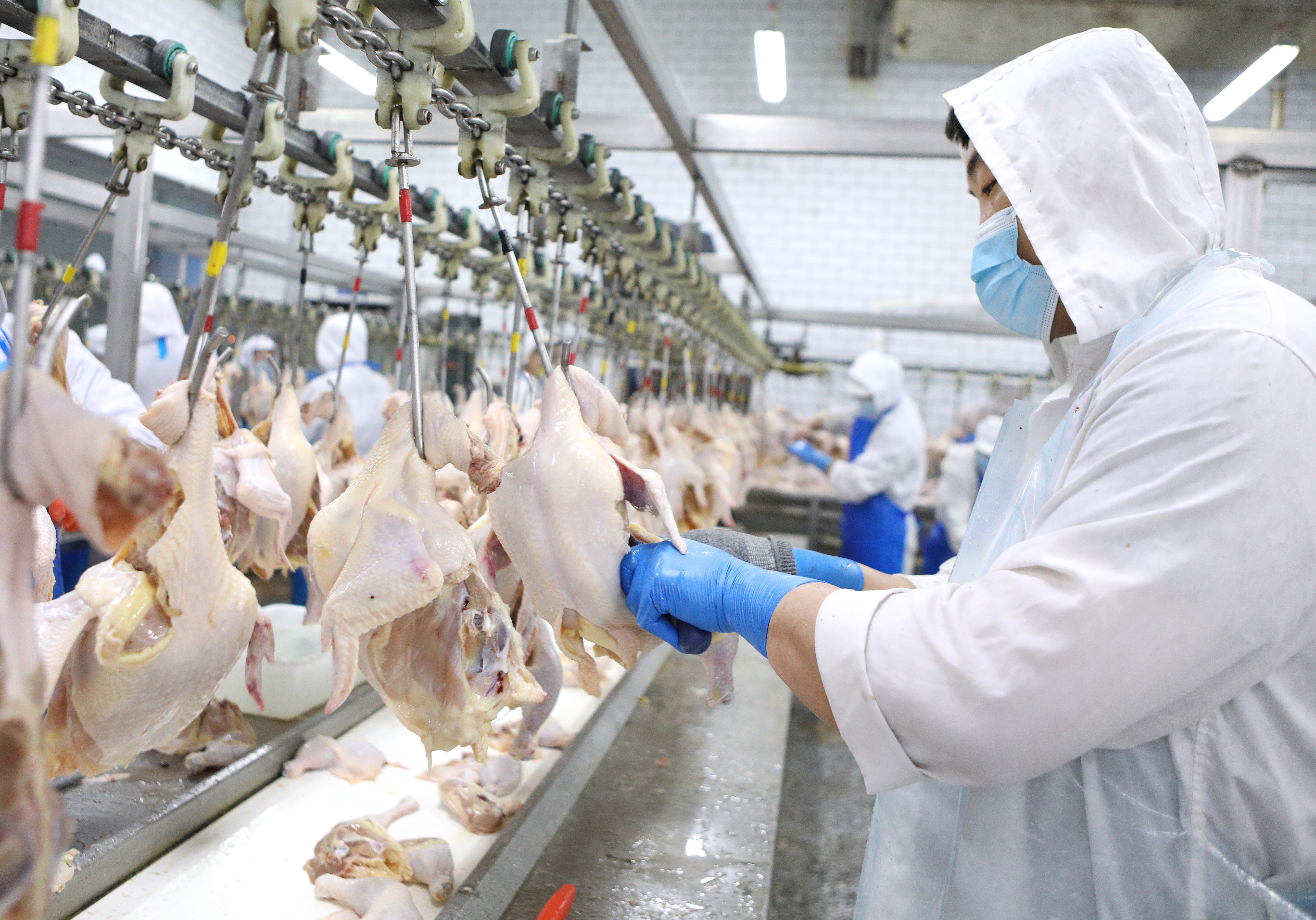 4月21日,工人在辽宁省鞍山市台安县一家食品有限责任公司白羽鸡加工流水线上工作。