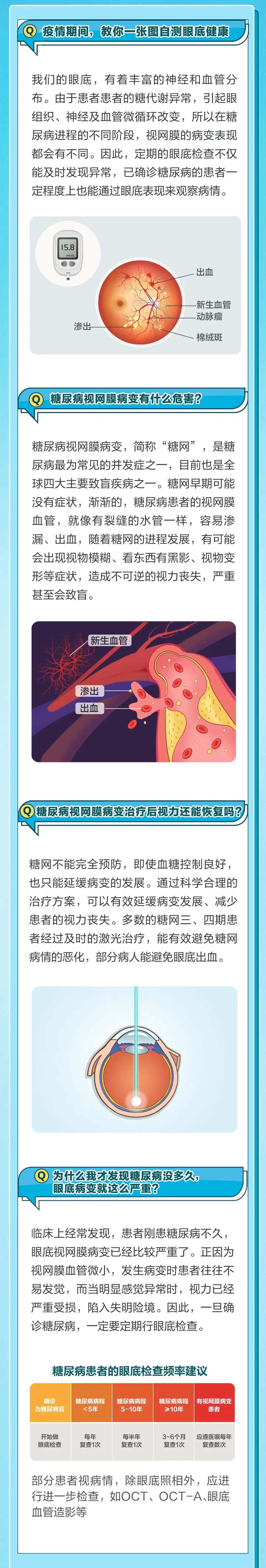 我们的眼底,有着丰富的神经和血管分布。由于患者患者的糖代谢异常,引起眼组织、神经及血管微循环改变,所以在糖尿病进程的不同阶段,视网膜的病变表现都会有不同。因此,定期的眼底检查不仅能及时发现异常,已确诊糖尿病的患者一定程度上也能通过眼底表现来观察病情。