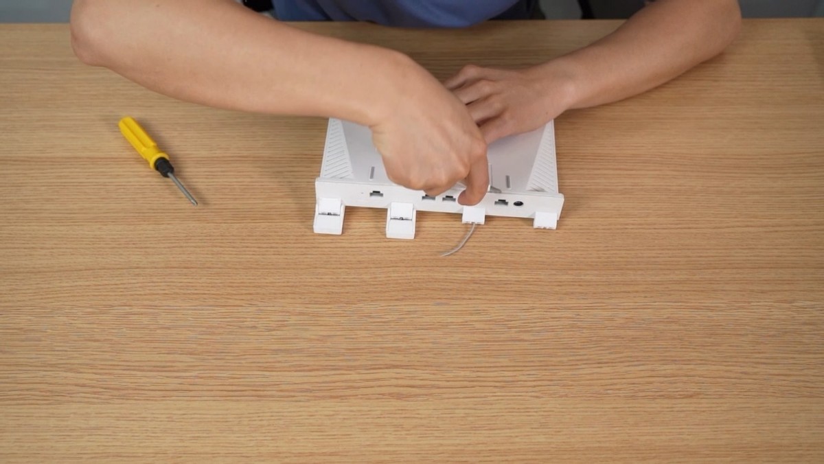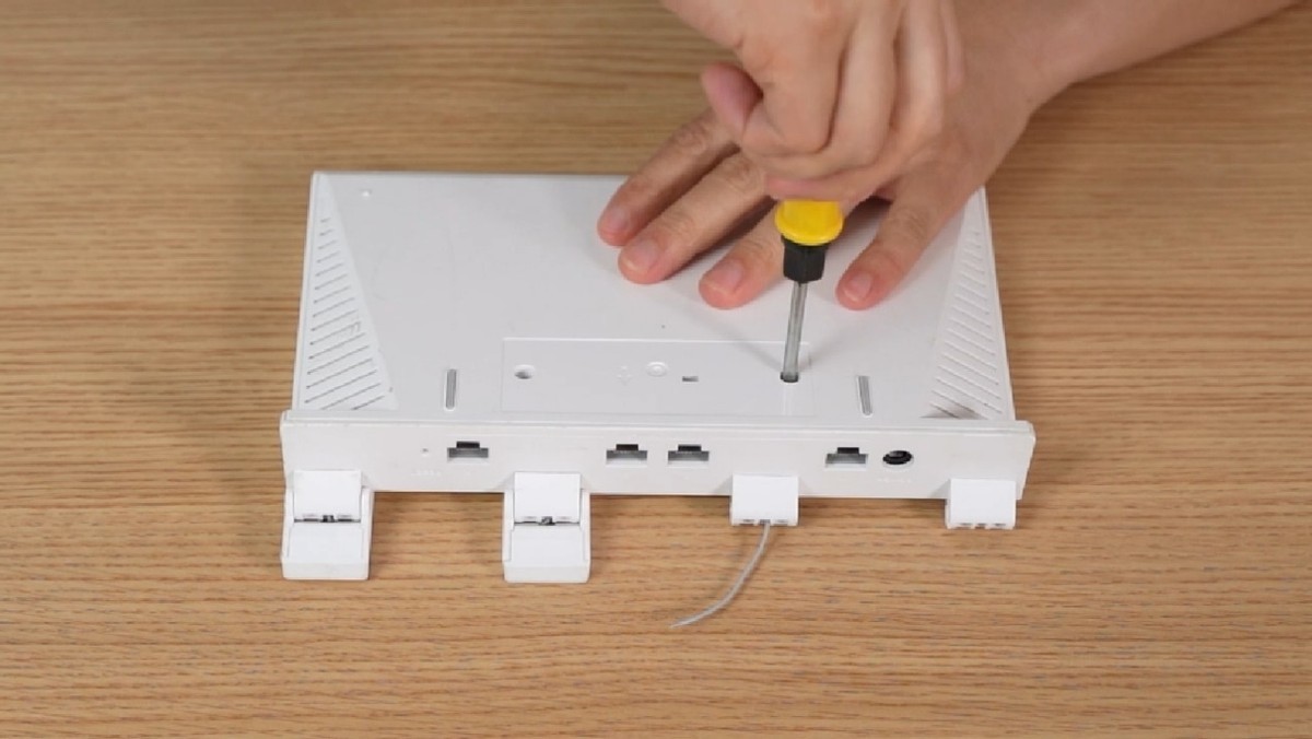 撕下标签后,我们看到有2颗螺丝,拧下螺丝,放在一旁,然后用小刀或者塑料片从顶部撬开路由器。撬的时候注意安全,不要伤到手了。