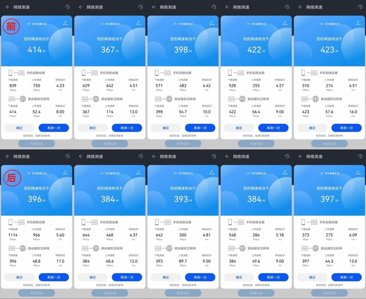 焊接完成后,我们装回后盖,拧上2颗螺丝,贴回标签,接下来我们测试一下,维修前后的信号和速率的变化。我们选择了5个位置点用相同的用华为mate30分别测试5G和2.4G的速率和信号强度。