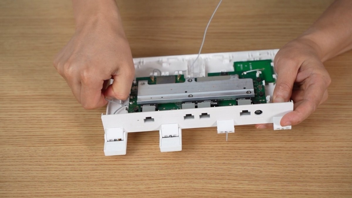 接下来开始安装新天线,先安装2.4G天线,把天线的线缆从孔位穿过去,穿过路由的主板,从对应的位置拉出, 然后把天线的卡扣对准路由器对应的位置,稍微用力把卡扣压进去,天线就安装好了。
