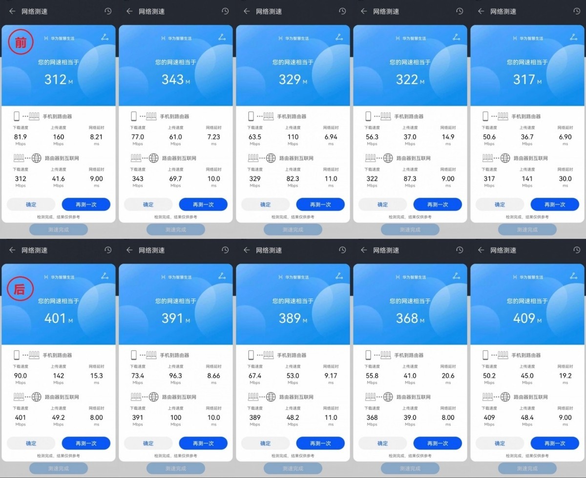 通过对比维修前后信号和速率的变化我们发现,更换2根天线后,不论是2.4G信号还是5G信号都有一定程度的提升。而速率方面,2.4G速率提升不明显,一方面的因为2.4G本身干扰就非常严重,我所在的地方,周围至少20个以上的WiFi信号,然后就是天线本身有细微的差别,可能会出现干扰,导致速率没有明显的提升,而延迟却有所增加。5G速率有比较明显的提升,而延迟并没有增加,说明5G天线还是起到了比较重要的作用,这也和我当初的预想比较相符了,5G频率高,抗干扰能力强,2.4G干扰比较严重,当初就想着主要是为了5G,2.4G有没有效果都无所谓,手机、电脑、电视都是连5G,2.4G一般给智能家居用,对于速率要求并不高。