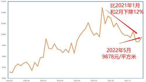 与2021年1月和2月的11228元/平方米的顶峰相比,每平方米下降了1350元,降幅达12%。