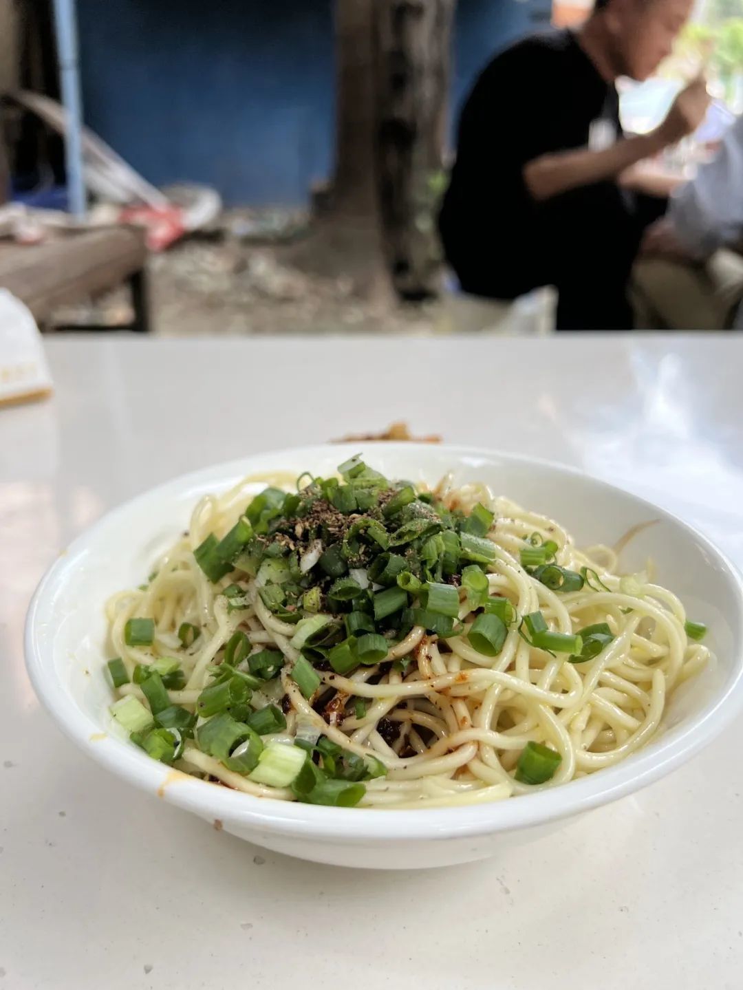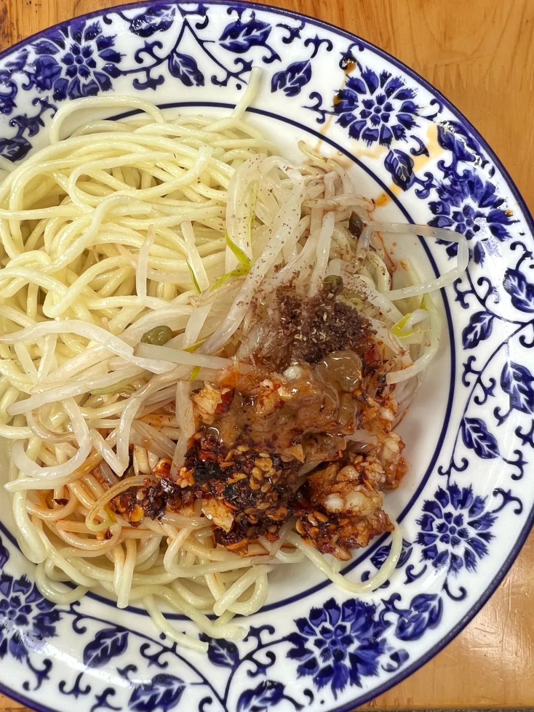 豆芽打底,面上是葱和少许花椒面,看这葱花儿和花椒面的新鲜度,就是知道是碗好吃的凉面。
