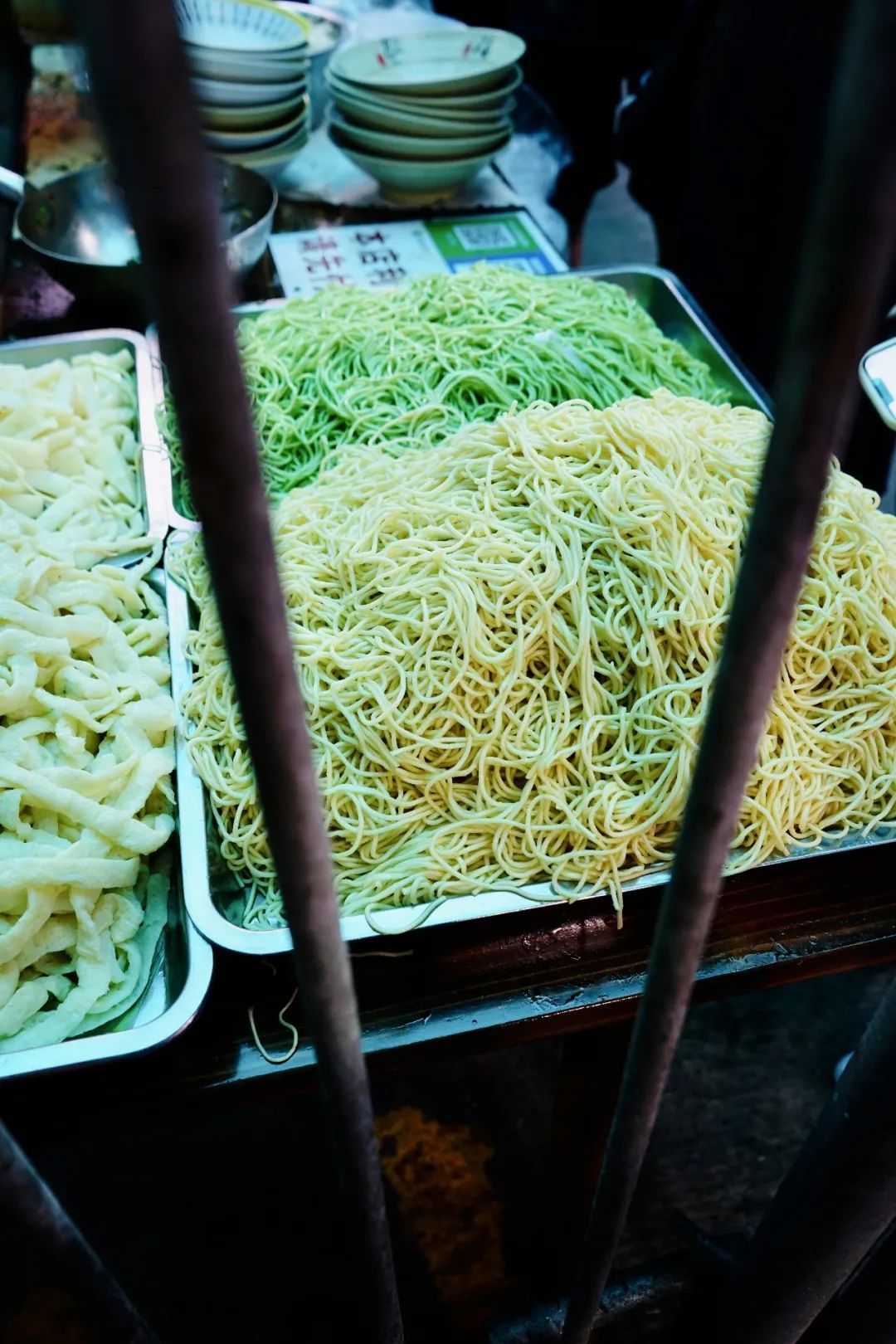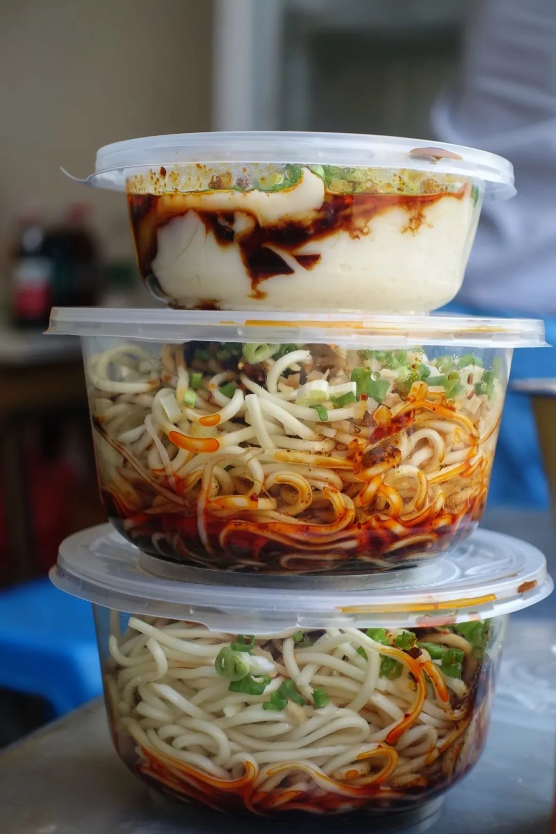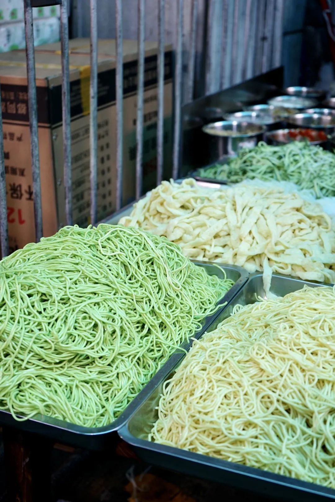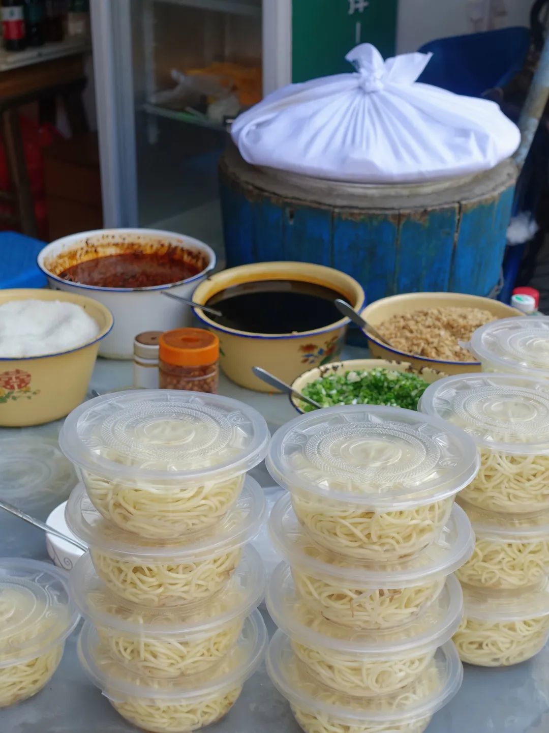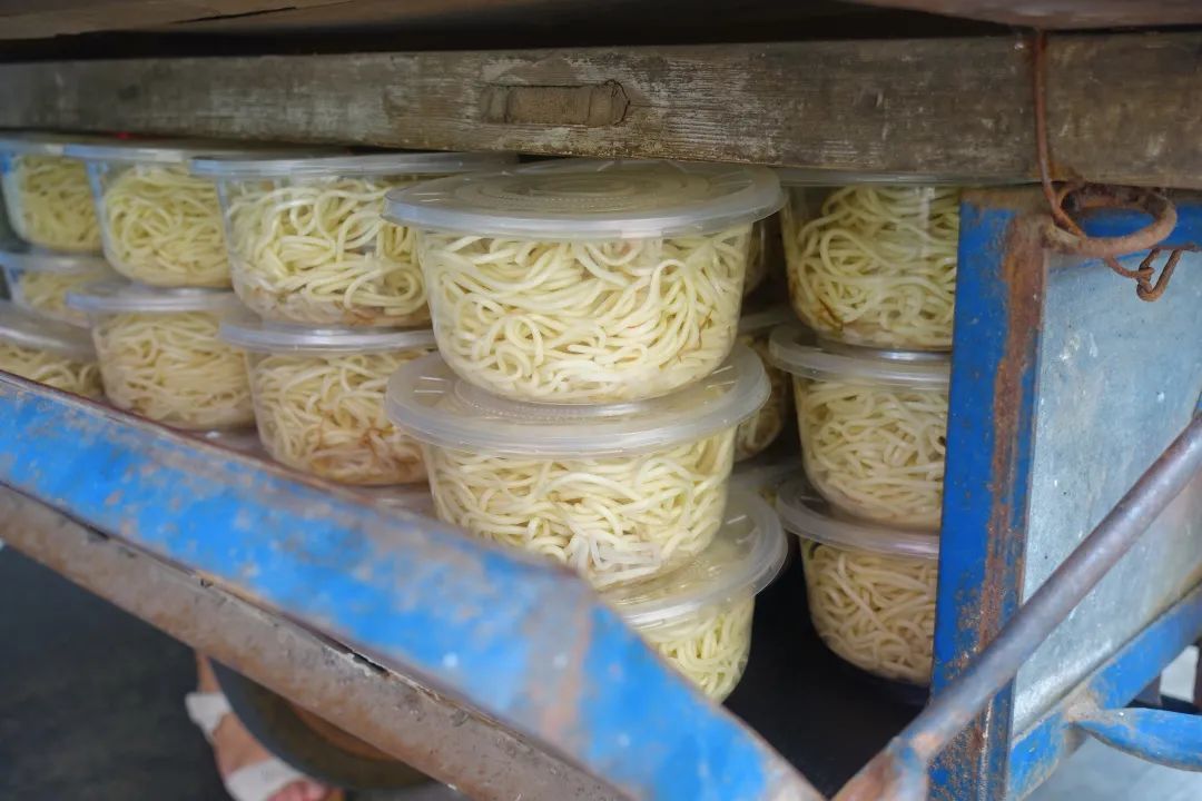 夸张到什么程度,桌子上是摆的凉面墙,背后墙角有两件凉面,一排一摞层峦叠嶂,就连三轮的车斗里都塞满了凉面。
